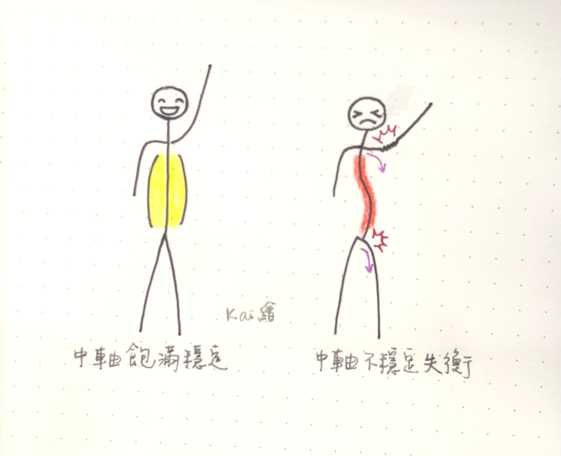 有些人肩頸痠痛,或是膝蓋不舒服,有可能可以歸因到中軸動作的偏斜。譬如臨床上常發現,很多長期肩膀有狀況或是下肢腳有問題的人,中軸的穩定其實都不足。